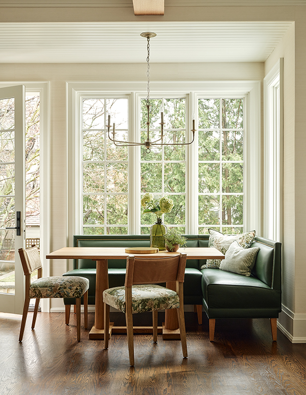 The banquette was on Beth’s wish list and she uses it for casual meals and hangouts. “Beth has a beautiful garden, which you have a great view of from this room, so we used the garden’s colours and textures to inspire the design,” notes Lindsey Mens. “Pops of green appear in the chair upholstery and banquette fabric, with lots of nods to the backyard colour palette throughout the rooms.”