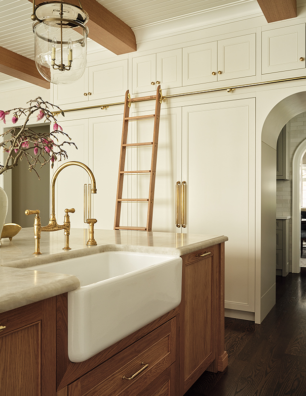 The ladder is elegant and functional; an apron sink adds a dose of farmhouse style. “I suggested the ladder because Beth and I are both really short! ” says Tommy. “It’s beautiful and practical for reaching high shelves. We also created a butler’s pantry for overflow and her collection of seasonal dishes — she goes all out for holidays.”