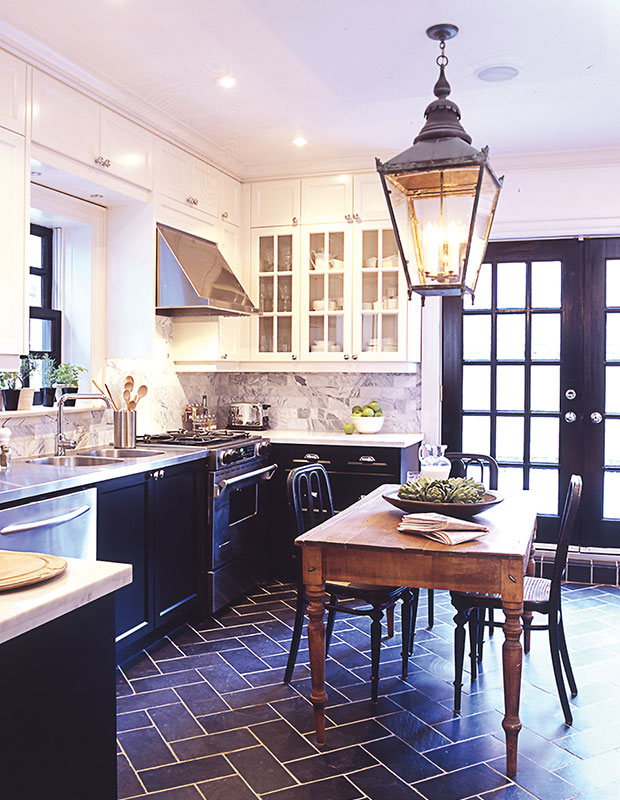 Preserving the home’s rustic country vibe meant installing a hearth-style vent hood, French inlayed slate floors strong enough to withstand the wear and tear of daily traffic, and matte white appliances that felt “friendlier than stainless steel,” says Tommy.