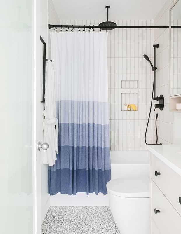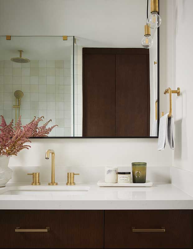Designer Cindy McKay’s advice for small space living? “Be willing to surrender your stuff and let things go, and be smart about your storage plan,” she says. The ensuite tub was removed to create a more generous shower enclosure lined with zellige tile.