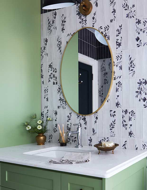 Bold wallpaper makes a statement in this main floor bathroom that packs in a petite vanity and a shower. “They’re small spaces, but you can go big on personality,” notes designer Jessica McGouran.