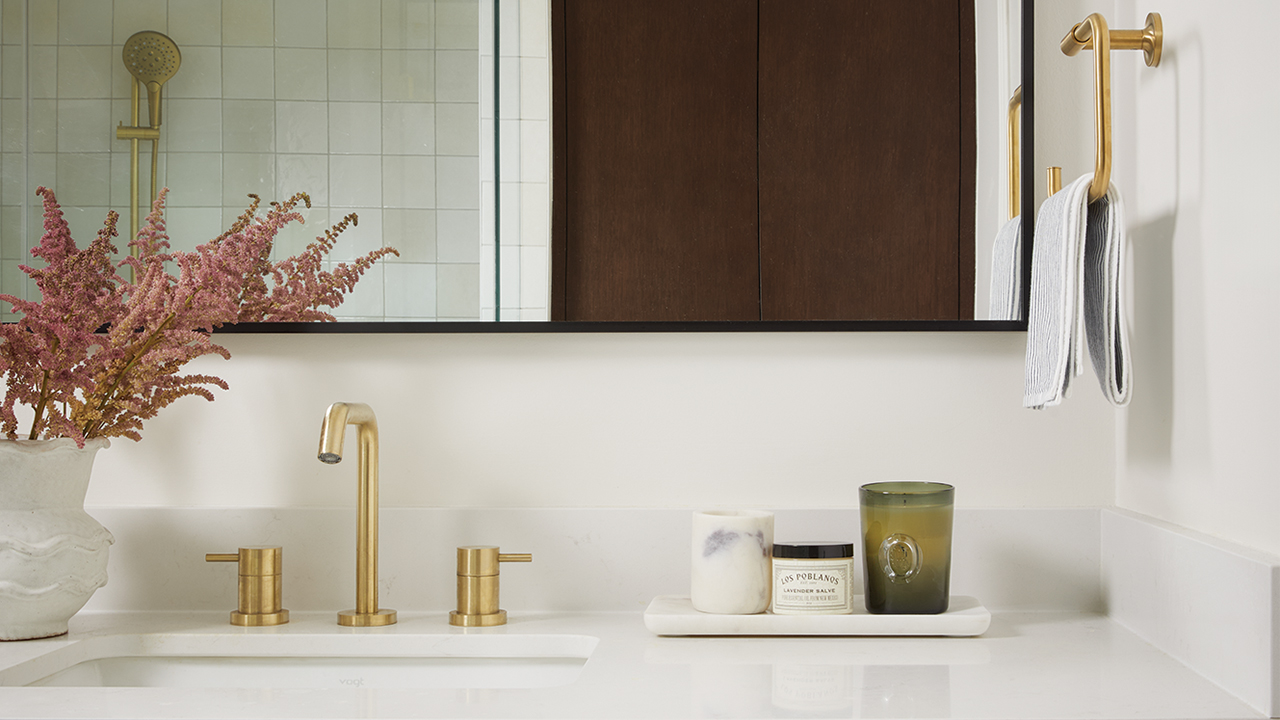 We’d like to wake up to this pretty and petite ensuite that features a bobble-framed mirror, pink vanity and glamorous brass accents.