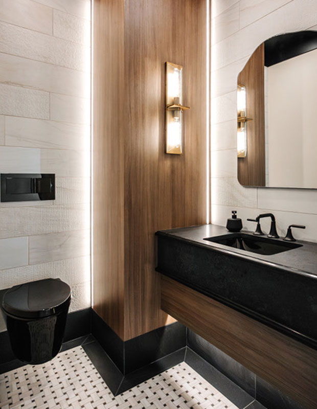 The powder room makes a bold statement with a dark, ogee-edge, apron-style vanity finished in Caesarstone 5820 Darcrest quartz — the perfect focal point to ground the space and showcase the material’s depth and character.