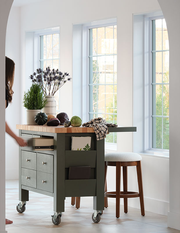 Canadel holds GREENGUARD certification, meaning the company practices sustainable manufacturing methods such as low volatile emissions, reduced energy consumption and obtaining materials from renewable resources. “Partnering with environmentally-responsible fabricators helps us create healthier, more sustainable homes for our clients, as well as provide us with peace of mind.” Kitchen island 4836; stool 9051.