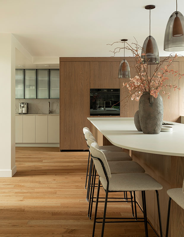 The kitchen’s feature wall is defined by tall, flat-paneled door fronts that mimic the look and feel of oak. This engineered material resists discolouration, helping ensure a longer lifespan. The paneled wall neatly conceals appliances and provides ample pantry storage. Akène Arabica European laminate door fronts.