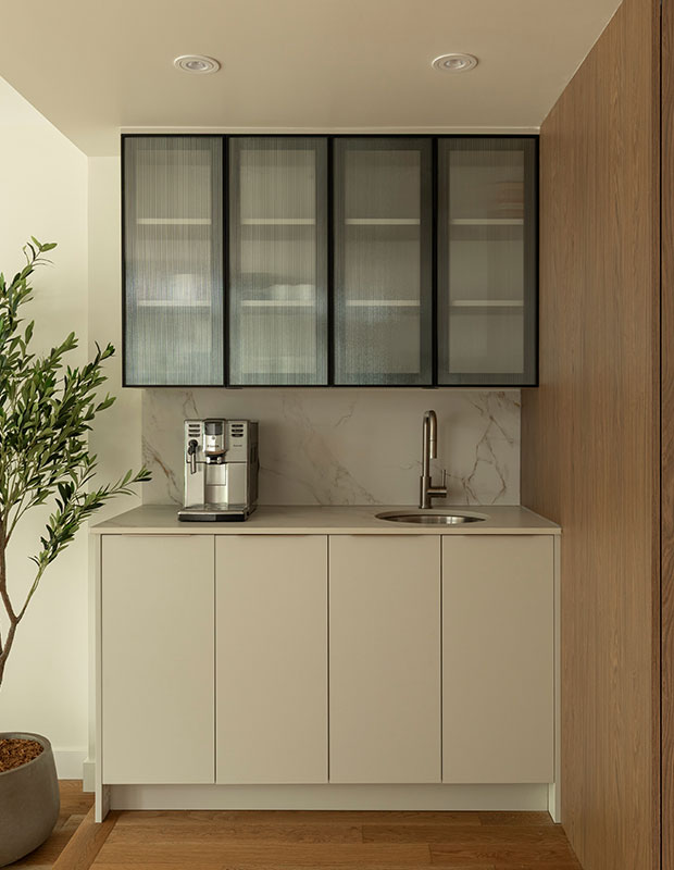 The family requested a coffee nook featuring a bar sink and elegant ribbed glass upper cabinets trimmed in black metal. Lower cabinets, Willow Grey European laminate door fronts.