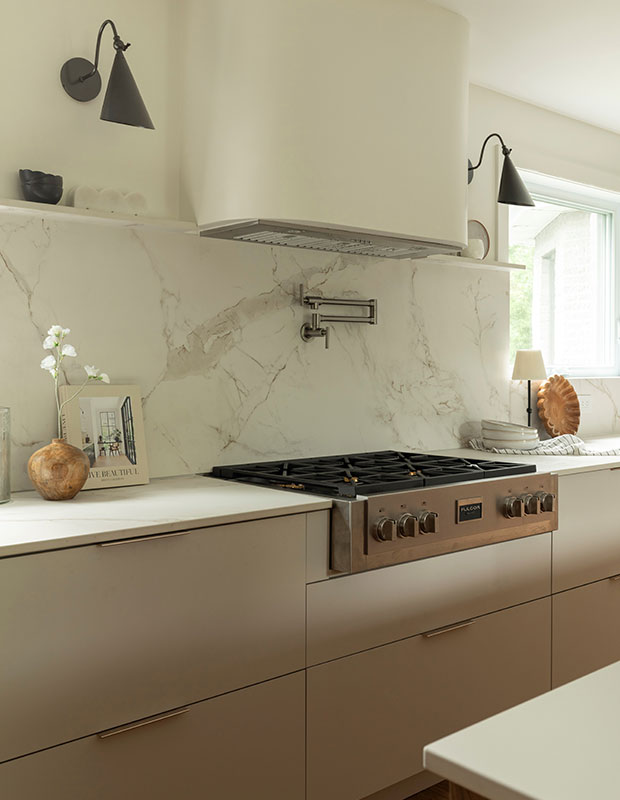 The most sustainable kitchen is the one you’ll never want to change, and this modern aesthetic makes a lasting impression. Lower cabinet door fronts in soft beige adds warmth to the space and coordinates perfectly with the custom curved vent hood that seems to disappear into the space above the cooktop.