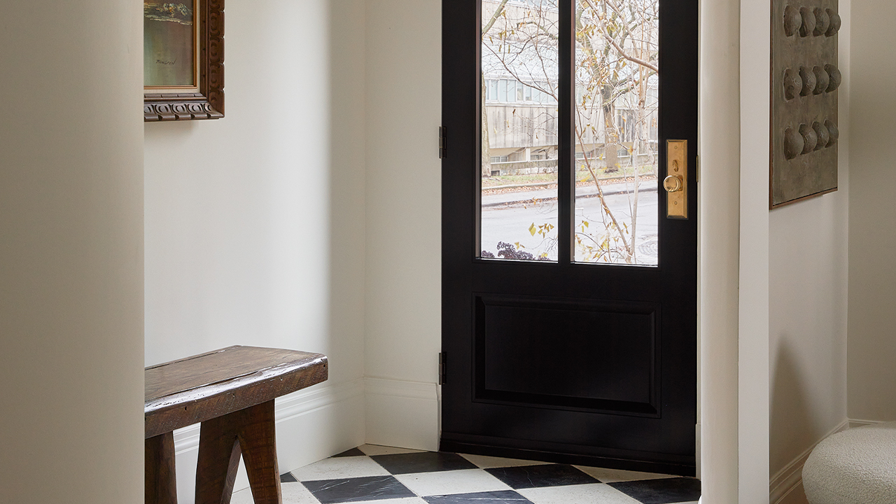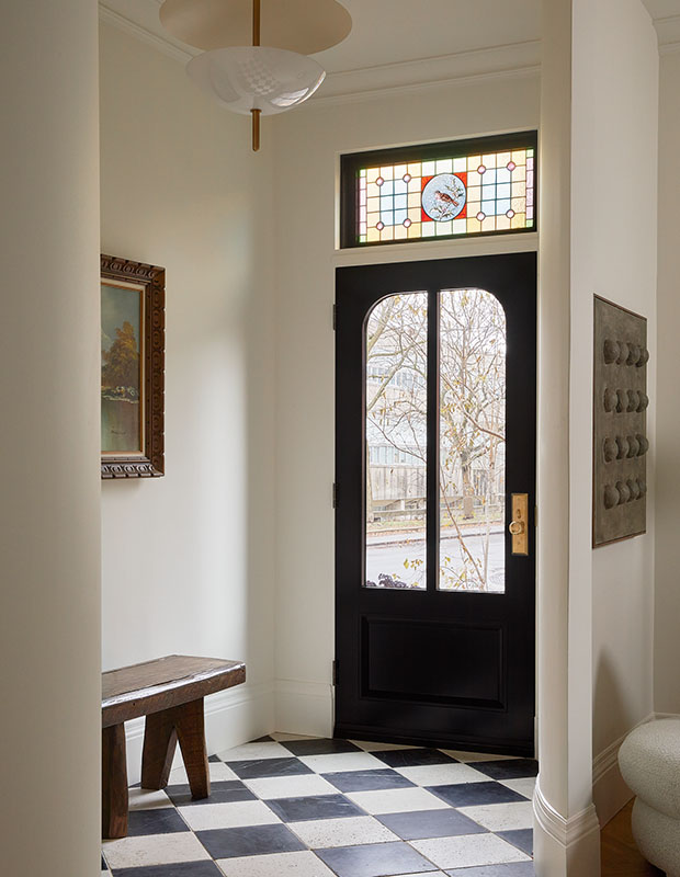 To honour her circa-1878 home’s history, designer Lyndsay Jacobs thoughtfully designed each room. When the front door couldn’t be saved, Lyndsay made a custom copy. Checkered floors and the original stained glass transom window complete the old world look.