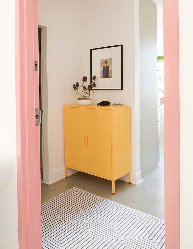 Designer Linda Lam’s hardworking Vancouver loft packs a punch. In the petite entryway, a bright yellow cabinet (a bargain find) neatly stores her shoes, while pink-painted doorjambs echo the front door for a playful hit of colour.