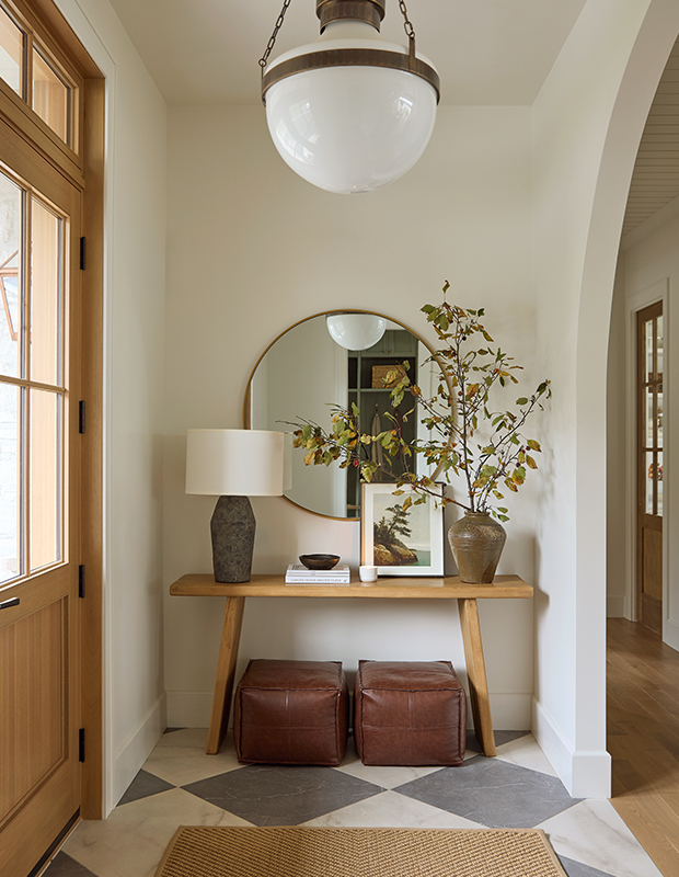 “Retiling a small area like a foyer can have a significant impact and can be done without disrupting the entire house,” says Emma Reddington of this entryway designed by Audrée Kemp Bélanger. Other updates like a mirror, table lamp and pretty accessories turn a utilitarian space into a considered design moment.