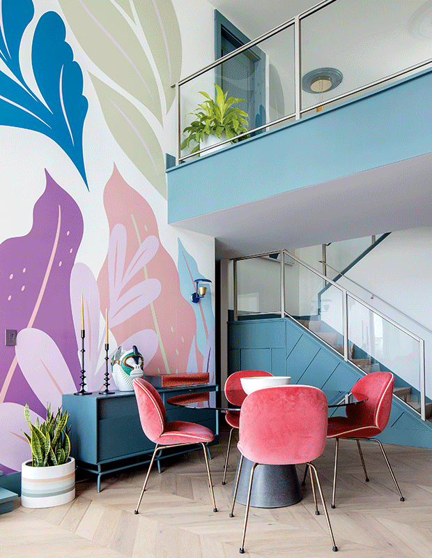 Designer Tanya McLean gave this new-build penthouse a sunny, Palm Springs–style disposition, no matter the weather. This two-level, 1,400-square-foot penthouse apartment in East Vancouver is a combo of banana leaf motifs and a beach-towel palette. “Most homeowners are cautious, but when you have clients who trust your design direction and allow you to be so creative, it’s a rare event. They didn’t want boring or beige; they wanted it to be lighter, brighter, uplifting and whimsical.”