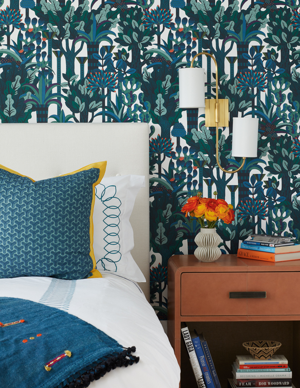 This bold botanical wallpaper is accented by a peacock pillow, trimmed in sunny yellow.