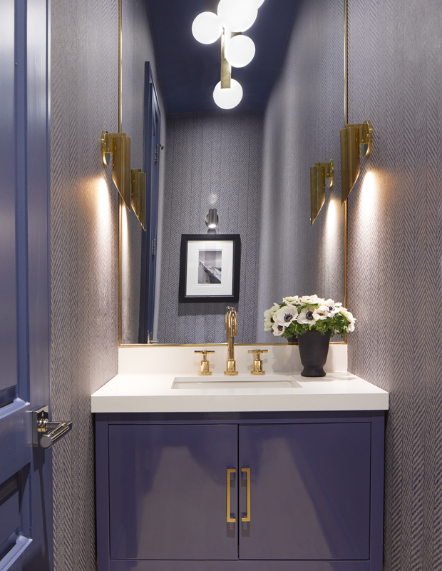 Touches of gold create a jewel-box effect in the dusky plum powder room. The lilac vanity and door amps up this saturated shade for a colour-drenched effect that’s luxe.