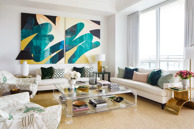 Real-estate broker Justine Deluce turned to designer Anne Hepfer, an intrepid colourist, to use bold strokes of saturated hues and graphic patterns to transform her Toronto apartment. In the living room, an abstract painting, velvet toss pillows and floral chairs inject juicy green notes.