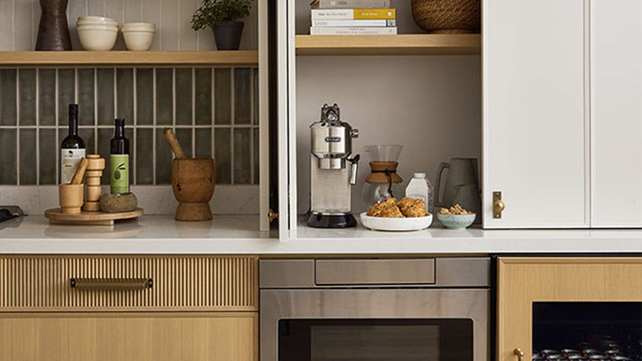 Shelves inset on either side of the custom niche provide great storage. “It’s nice to hide everything away yet have easy access to the things we need,” adds Krista. “It’s easily one of my favourite parts of the kitchen.”