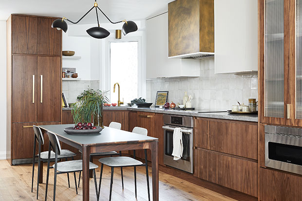 “In a rowhouse, there’s not a huge amount of space for a kitchen,” says fashion stylist and homeowner Erica Wark of the Victorian house she shares with husband Corey Laurysen, a third-generation owner of Laurysen Kitchens. Because the kitchen is petite and open to the rest of the house, the design team made sure to use visual, material and colour cues that would connect it to the rest of the main floor’s eclectic schemes. “The plaster crown was added to match the one we selected for the whole main floor,” says Tommy. “Here we chose the same profile but a scaled-down version to connect better with the scale of the millwork.”