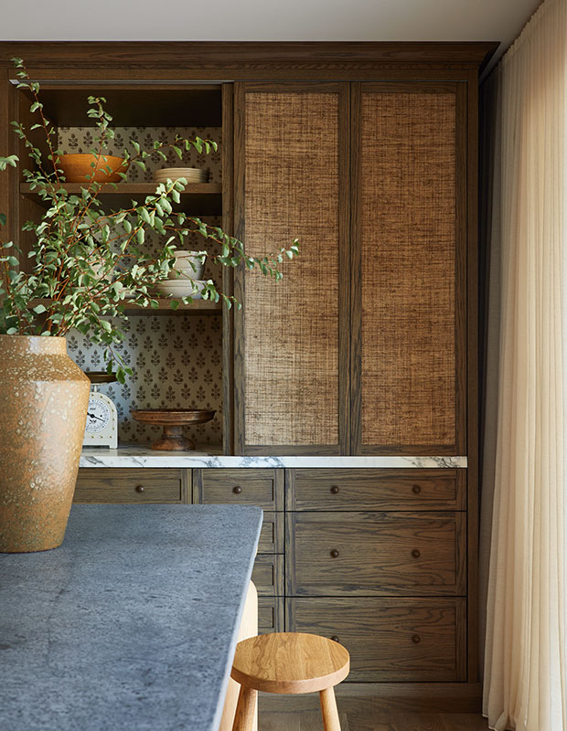 Krista wanted a walk-in pantry, but it didn’t fit into the new layout. Instead, a built-in hutch with an antique look houses the appliance garage, linens and dishware. “The unit has grasscloth details on the doors and a patterned wallpaper on the interior; it looks like an antique piece,” says Alana.