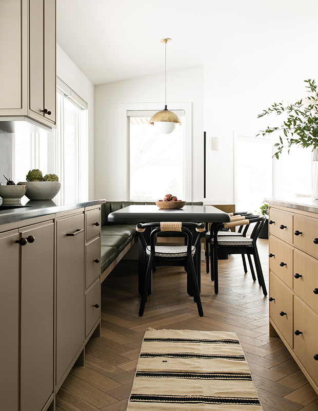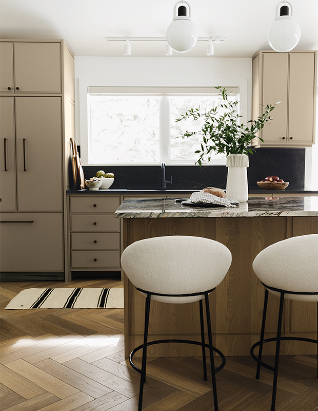 White oak herringbone-patterned floors evoke the era of kitten heels and MCM glamour while the kitchen’s dark tones, cocktail bar seating and matte black soapstone counters create a moody, unexpectedly sexy vibe.