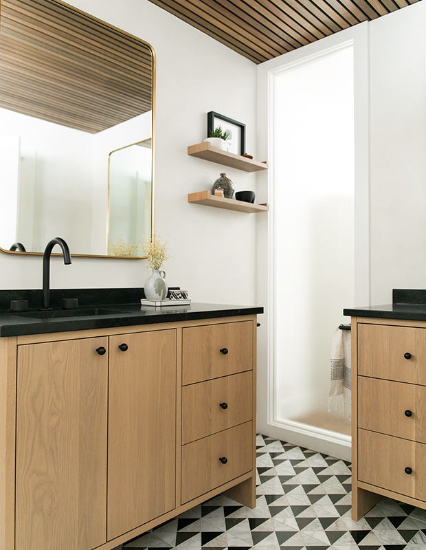 Cedar slats and white oak vanities are a warm contrast to the ensuite bathroom’s soapstone counters. Marble mosaic floor tiles echo the V-shape of the house.