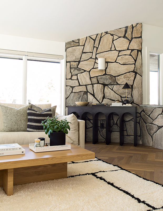 Because the stone is such a strong element, there are few patterns in the living room. The home has lots of natural light, so Jaclyn opted for minimal fixtures with a sleek ’70s look.