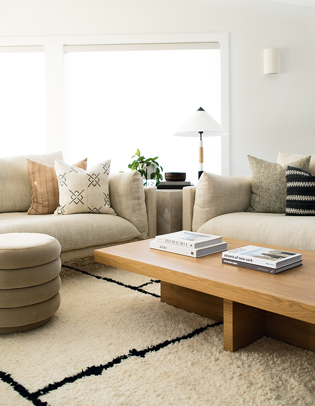 The soothing neutral palette is inspired by a wedge-shaped, 50-year-old Manitoba stone fireplace Jaclyn describes as “the heart and soul of this house.” Because the stone is such a strong element, there are few patterns in the living room. The home has lots of natural light, so Jaclyn opted for minimal fixtures with a sleek ’70s look.