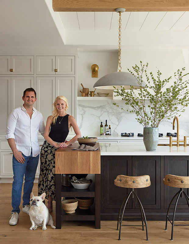 The trio created the incredible English-style modern farmhouse kitchen with its face frame cabinets and substantial chopping block, the living room and its black built-ins, and the laundry room. The dynamic mix of lighting and furniture, though, are all Sarah and Jason, pictured next to Lily, their charming French bulldog. The fridge and wall ovens are surrounded by white oak cabinets.