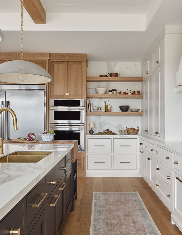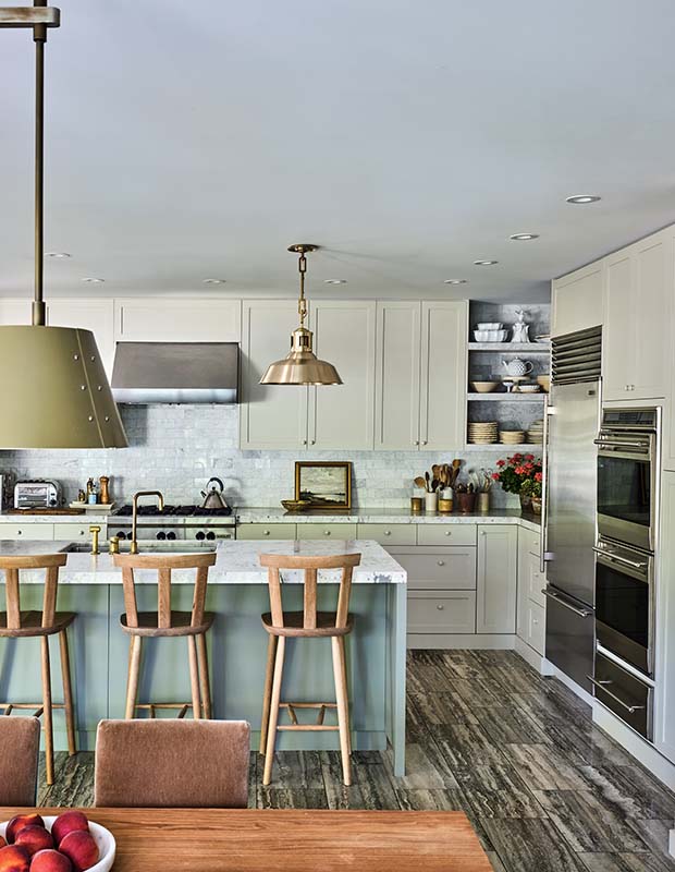 The once contemporary kitchen got a dash of English farmhouse style with brass lighting and faucets, and the Calacatta marble waterfall gables were removed on the island to help “quiet” the space.