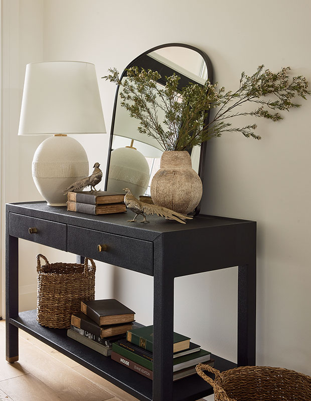 “I wanted the foyer to be layered and cosy,” says Sarah. The Toulon lamp tops the navy console.