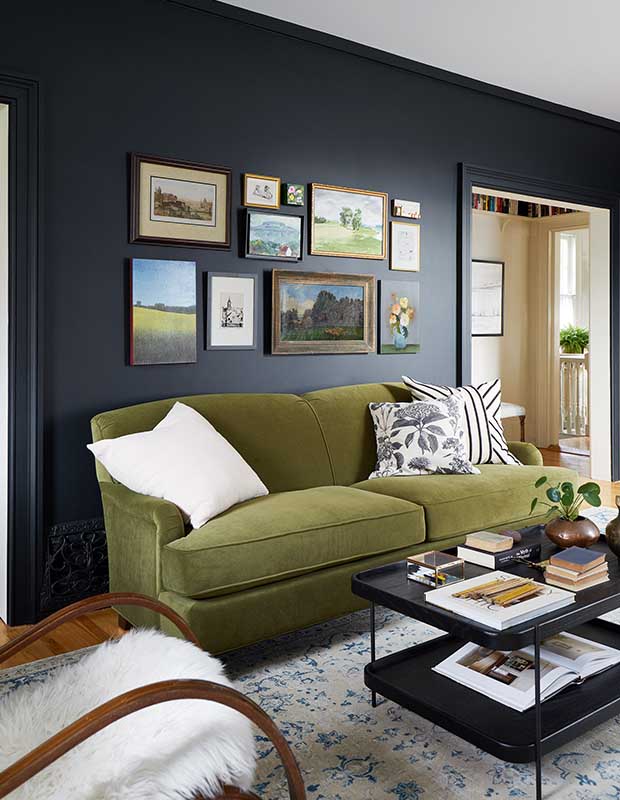 Orsi knocked down a wall to expand the footprint of the kitchen. Collections are prominent here — copper pots in the kitchen, a gallery wall of treasured paintings in the living room, books styled on high shelves in the hallway, and Orsi’s father’s measuring sticks sit out on the coffee table (he was a teacher who loved to build and create in his spare time).