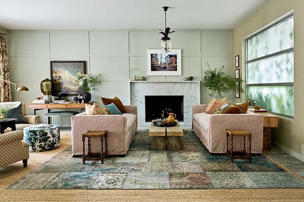 In the living room refresh, Rosie balked at reupholstering the twin sofas’ luxe pink mohair, opting instead for floral mini-print slipcovers.
