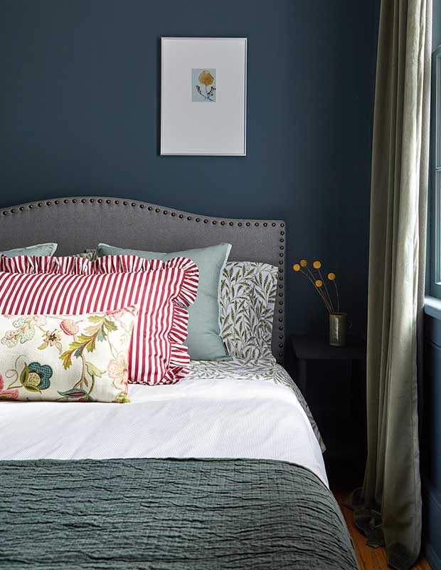 This bedroom is painted in deep blue, where traditional, layered bedding adds to the cottage feel.