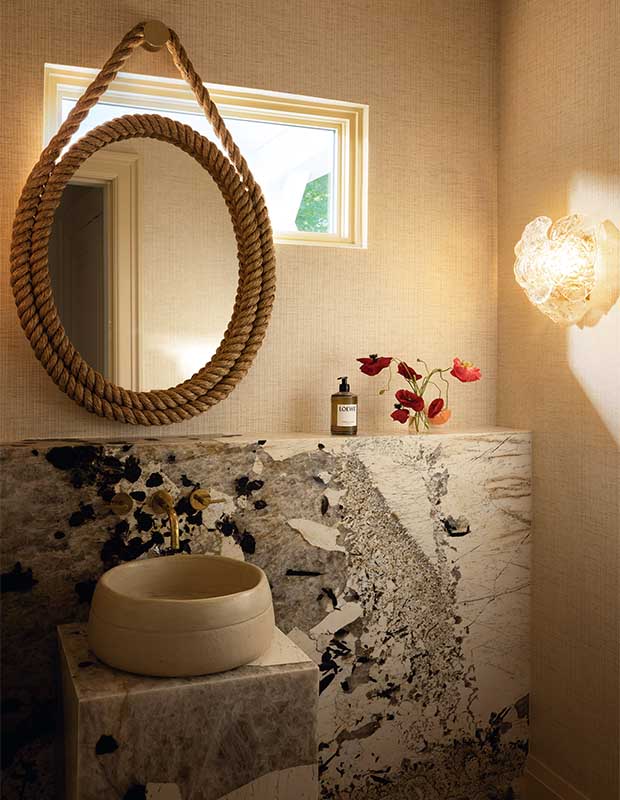 “Our powder room is possibly my favourite bathroom ever,” says Melanie. A stretch of Patagonia granite defines the look, and the walls above are wrapped in grasscloth. Having the granite pedestal custom made was one of the project’s bigger splurges. The plaster sink echoes the clay tub in the principal bathroom.
