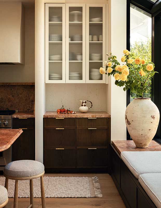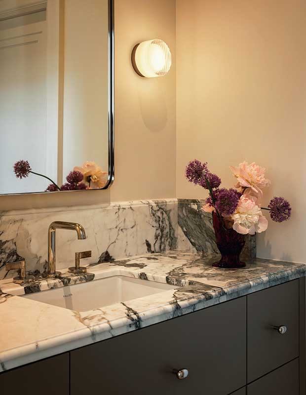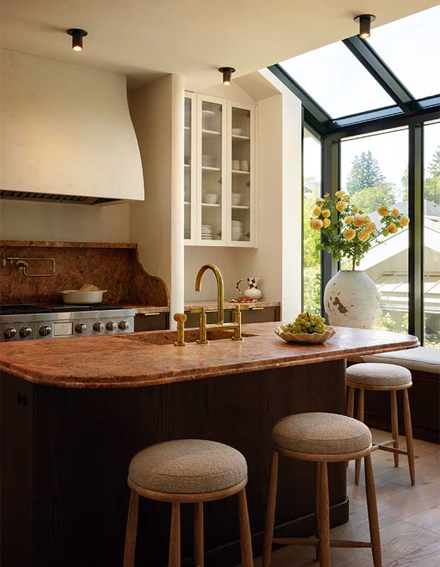 “The original kitchen had a terracotta-coloured tile floor and dark wood cabinets,” says Melanie. “We took inspiration from that palette for the new space.” The Breccia Pernice marble backsplash and counters echo the terracotta hues and an unlacquered brass faucet is a deft finishing touch.