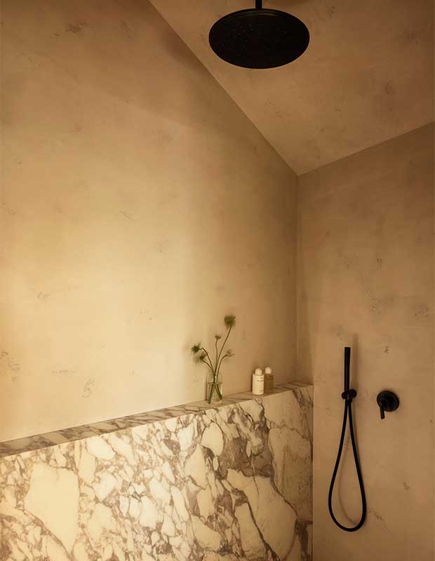 Calacatta Vagli marble carries into the principal shower enclosure; the walls are finished in plaster.