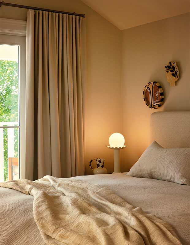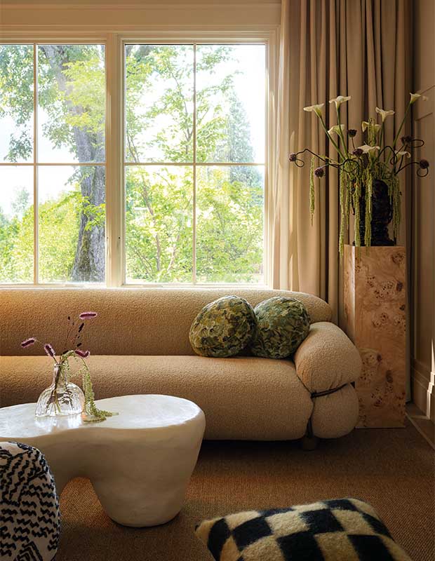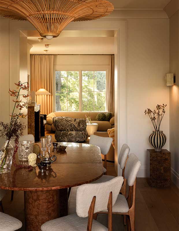 Melanie and Alex were drawn to Gillian’s unexpected and unique style, and the way she wanted to push them outside their comfort zone. Gillian says it didn’t take long for her to realize that her modern-eclectic maximalist aesthetic meshed beautifully with Melanie’s minimalist bohemian vibe. “We both like mixing old and new, natural materials and layered textures,” says the designer.