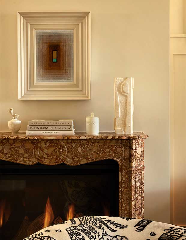 Striking natural stone is in abundance. Terracotta-toned Breccia Pernice marble is the centerpiece of the kitchen, there’s Calacatta Vagli in the ensuite, and the antique marble mantelpiece, with its burgundy and cream hues, is from an antiques dealer who finds pieces at estate sales. “I can only imagine all the life it has seen,” says Melanie. “It’s the focal point of our living room and it brings me so much joy.”