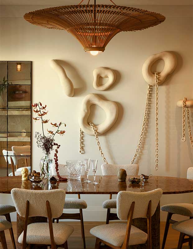 A local ceramicist was commissioned to create the dining room’s stunning wall sculpture, which almost looks like jewelry — especially fitting for this homeowner.