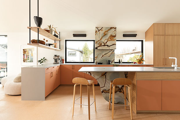 Emily didn’t want a white kitchen, noting that the cabinets painted in a terracotta shade feel bold but also surprisingly calm.