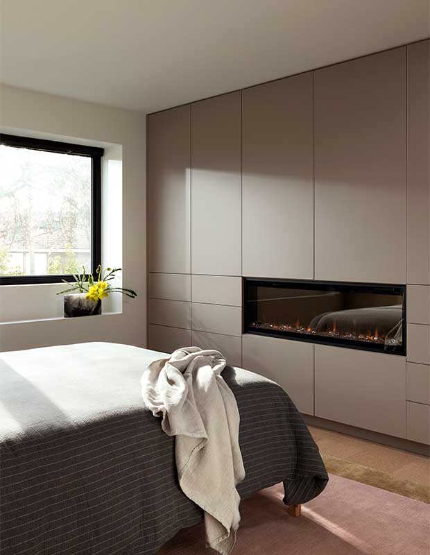 The ground-floor principal bedroom boasts a wall of storage with an integrated linear fireplace.