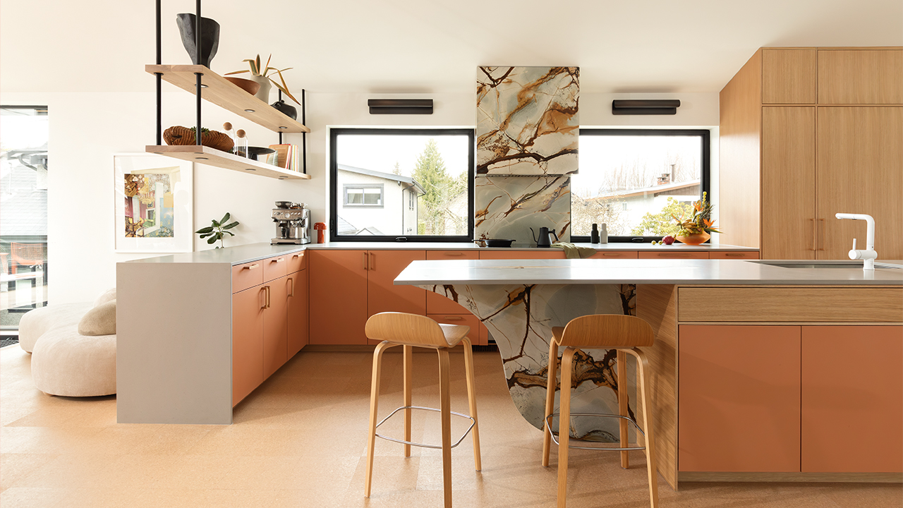 In the kitchen, terracotta-hued cabinets are paired with honed quartz counters; rare Blue Stone quartzite is striking on the vent hood, backsplash and island.