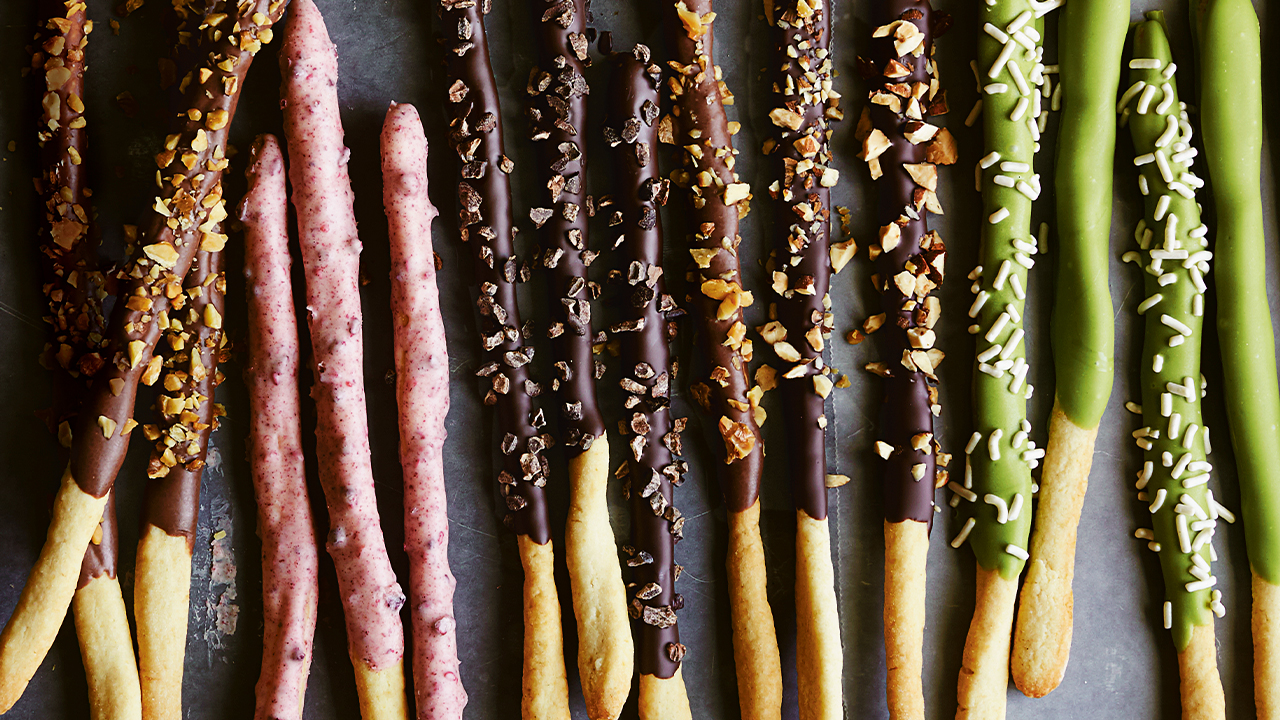 - Line baking sheet with parchment or wax paper and keep nearby. Holding cookie stick over bowl of chocolate, use small spoon to pour chocolate over twothirds of stick, turning cookie to coat on all sides. Let excess drip off and scrape cookie bottom against edge of bowl. Set chocolate-coated cookie on lined baking sheet. Sprinkle with nibs or nuts as desired. Repeat process with all cookies. (Keep all dips in a warm place while working with them, and return to pot or microwave to remelt if needed.)
